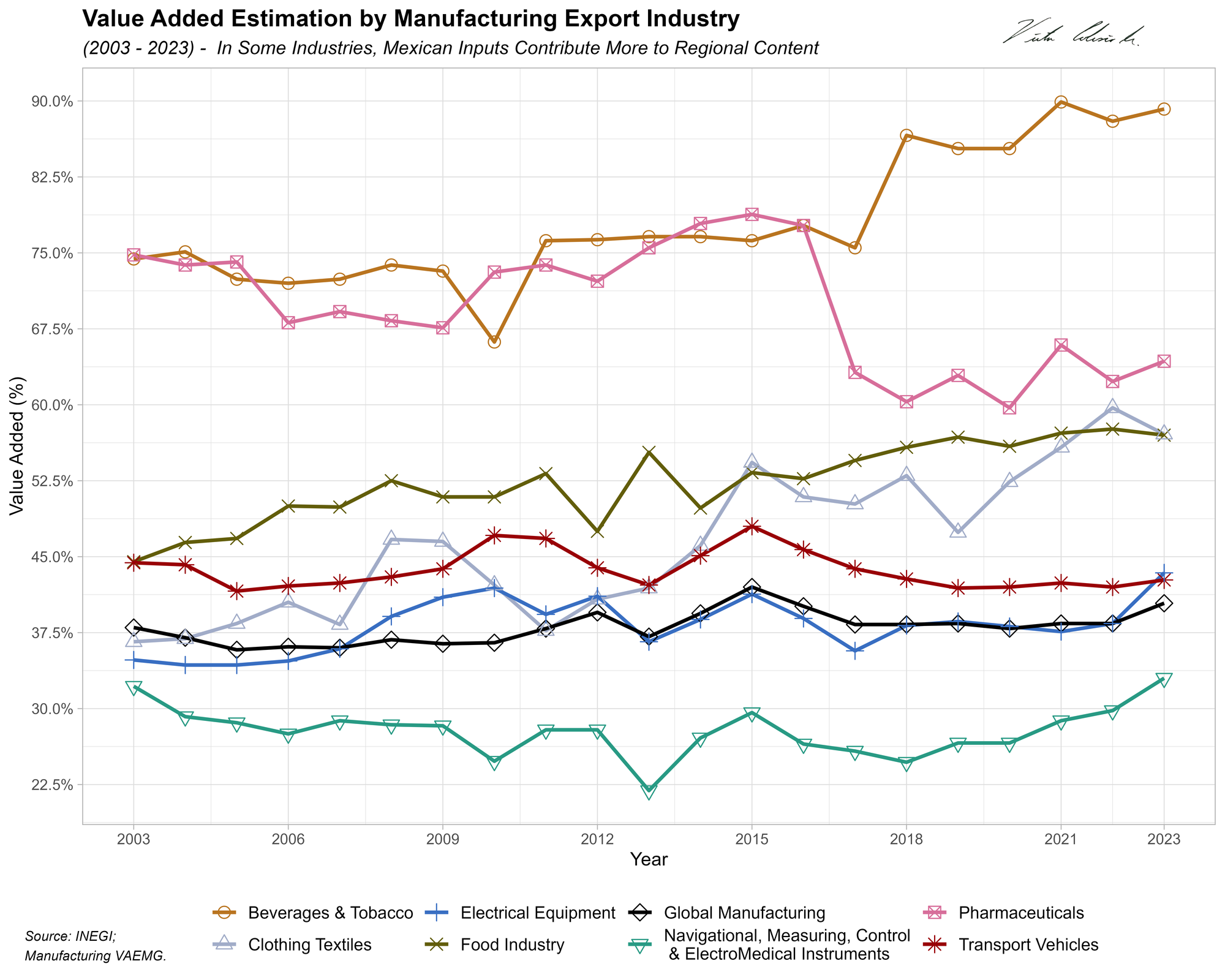 Average value-added content for Mexican export manufacturing oscillates between $35 to $42 out of every $100 exported when considering all the manufacturing sectors; with a 10-year historical average of $38. Some sectors perform better than others; beverages is a notorious national industry success, ubiquitous in the different brands and shelves across the U.S. (almost 90% of what is exported in beverages to the U.S. is Mexican content). While other industries such as those in precision & electromedical instruments reflect a more complex supply chain integration; supported greatly by intermediate inputs of diverse country origins. While value-added is not necessarily a measure of the quality of the jobs related nor of the export-size, it is however a direct proxy of labor content paid (wage mass) as well as firms’ utilities and payments to capital in Mexico. More of this should be indicative of where some industries are more self-sufficient in their input and production process. These kinds of indicators, adapted to local contexts, should be the guidance of subregional governments in their promotion activities, diversification efforts and strengths assessment grounded in realistic standing. This measure is probably also relatable to competitiveness terms (allowing for global benchmarking).